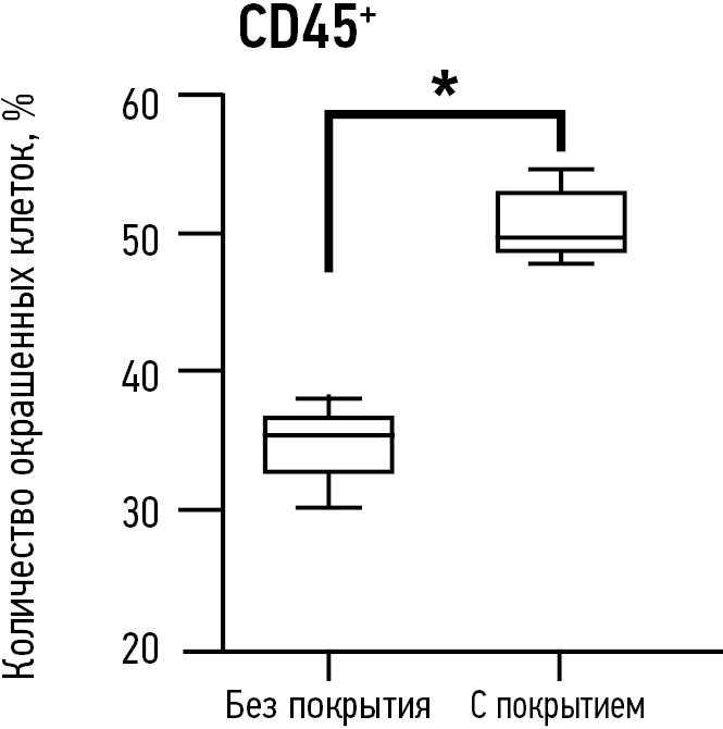 Рис. 5. Процент CD45+ клеток после инкубации с образцами имплантатов с покрытием и без него; * p < 0,05 согласно t-тесту.