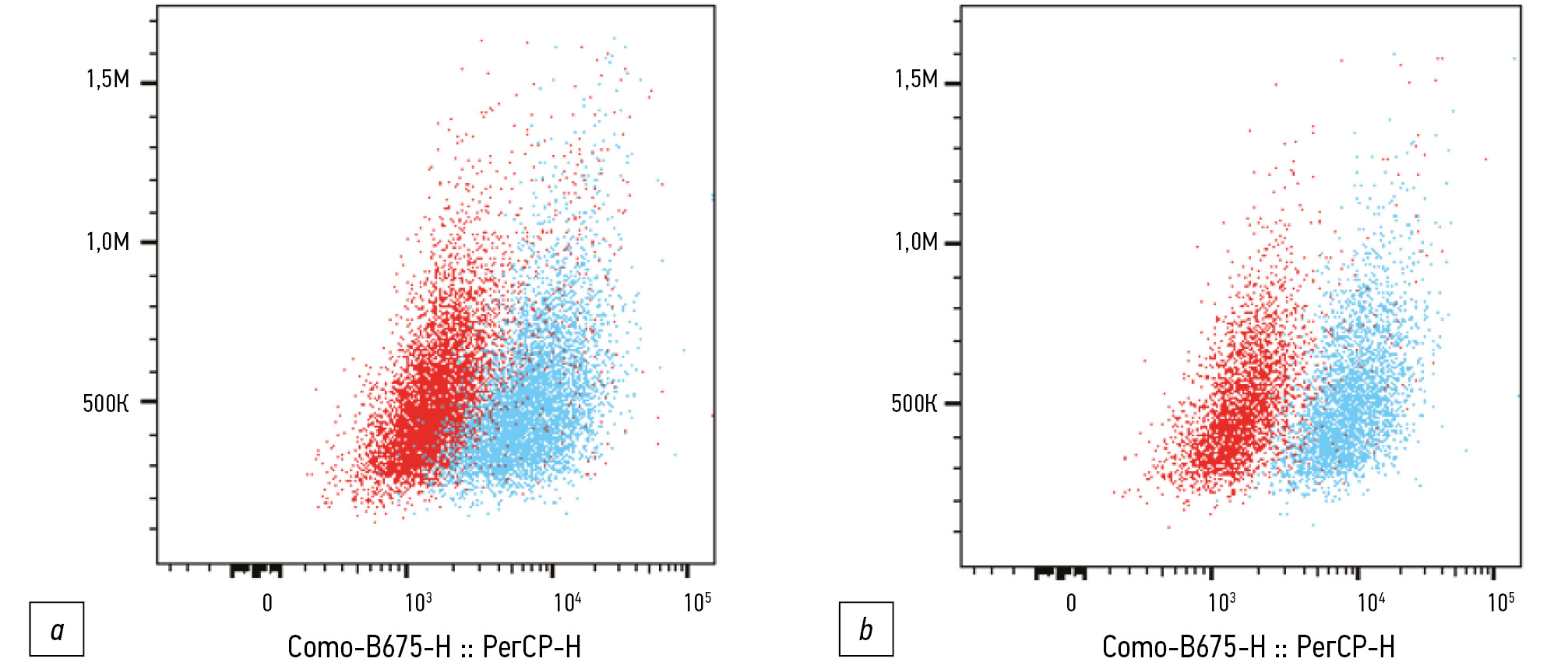 Рис. 6. Репрезентативное окрашивание клеток ТНР-1 антителами к CD45+ (голубое окрашивание) после инкубации клеток с образцами имплантатов без покрытия (a) и с покрытием (b). Красное окрашивание — контрольные клетки.
