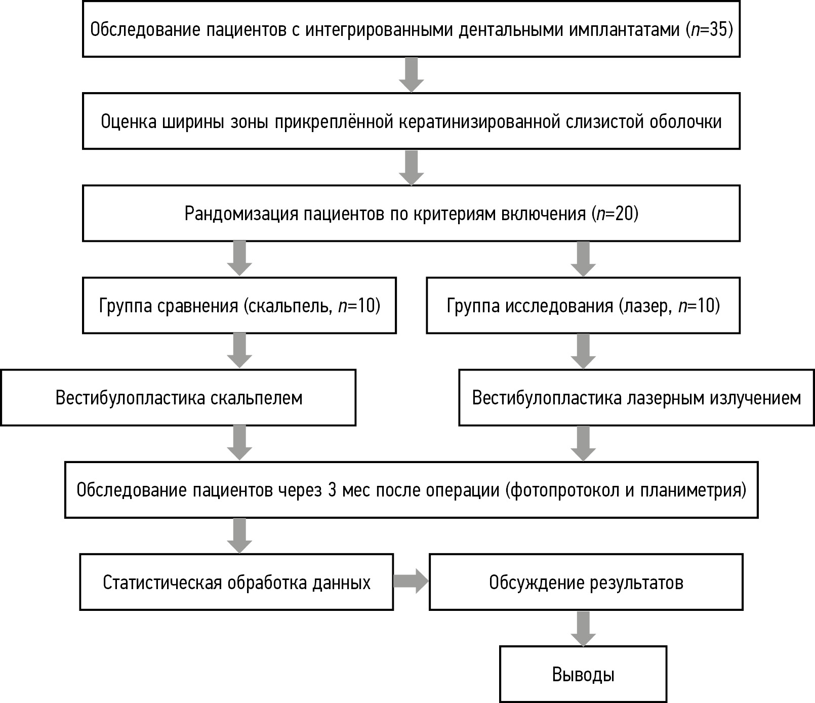 Обследованы и прооперированы 35 пациентов с диагнозом по МКБ-10 «частичное отсутствие зубов» — К08.1, у которых в результате стандартного осмотра с применением дополнительных инструментальных методов исследования был выявлен дефицит ширины зоны прикреплённой кератинизированной слизистой оболочки в области интегрированных дентальных имплантатов. Из-за неявки на контрольные осмотры из исследования выбыли 3 пациента, 10 человек не явились на контрольный осмотр через 3 мес после оперативного вмешательства, 2 пациента отказались продолжать участие в исследовании. В итоге в исследование вошли 10 женщин и 10 мужчин в возрасте от 32 до 66 лет, сопоставимых по полу и возрасту. Сформированы 2 группы: исследования, в которую вошли 10 пациентов, прооперированных с помощью лазера; сравнения, в которой также 10 пациентов прооперировали с использованием режущих инструментов (скальпель). Средний возраст пациентов составил 47,3 года (51,50 ± 11,81 и 43,10 ± 7,03 по группам соответственно).