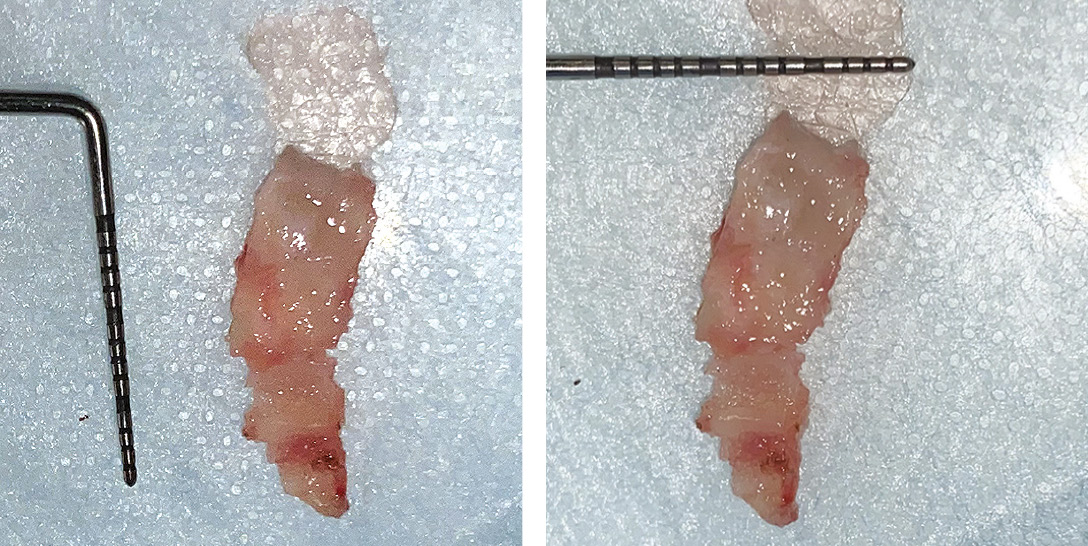 Свободный десневой трансплантат забирали с области твёрдого нёба в проекции зубов 1.3–1.7. Отступая на 3 мм от дна зубодесневой борозды, проводили первый разрез скальпелем № 15C, погружая лезвие на глубину 1,0–1,5 мм под углом 45 °. Далее формировали медиальный и дистальный края будущего трансплантата, осуществляя расщепление лоскута. Удерживая лоскут пинцетом, проводили разрез, параллельный первому, определяющий его ширину. Железистые включения и остатки жировой ткани удаляли при помощи скальпеля (рис. 3). Трансплантат укладывали в реципиентную область и фиксировали швами к надкостнице нитью АрмаПВДФ 5.0 с помощью колющей иглы 3/8 (рис. 4).