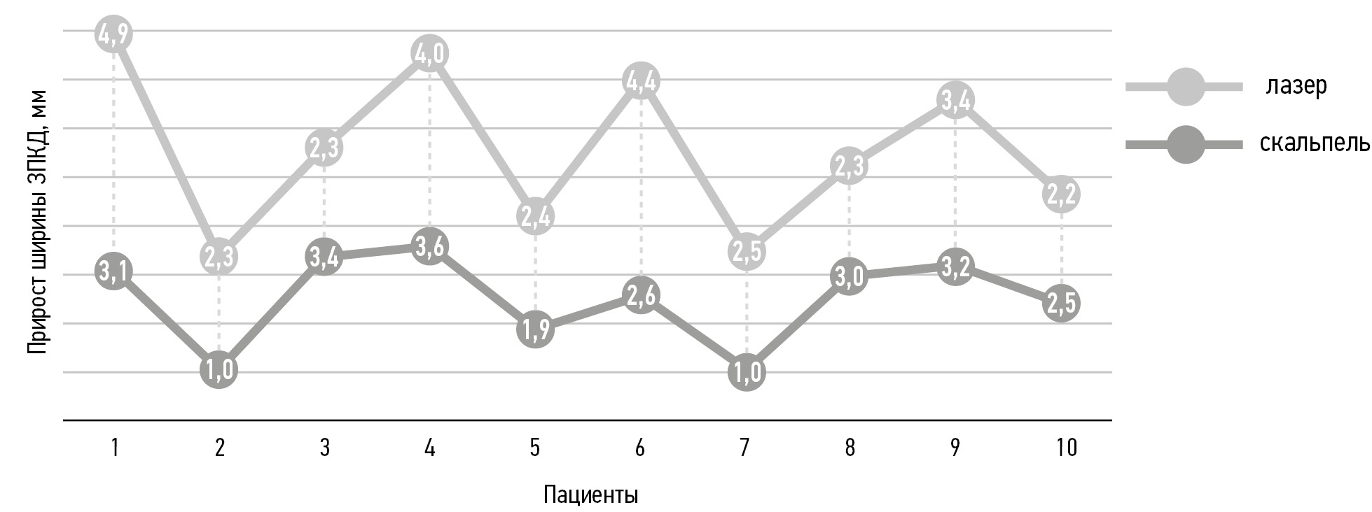 Средний прирост ширины прикреплённой кератинизированной слизистой оболочки у пациентов группы сравнения составил 2,29 ± 1,10 мм, минимальный прирост — 0,3 мм, максимальный — 3,6 мм, медиана числовых значений — 2,55 мм. Средний прирост ширины прикреплённой кератинизированной слизистой оболочки у пациентов группы исследования составил 2,88 ± 1,12 мм, минимальный — 1 мм, максимальный — 5,4 мм, медиана — 2,7 мм. Согласно t-критерию, прирост ширины прикреплённой кератинизированной слизистой оболочки имеет статистически значимое различие у пациентов, прооперированных скальпелем и лазером, — p < 0,045398 (рис. 7).