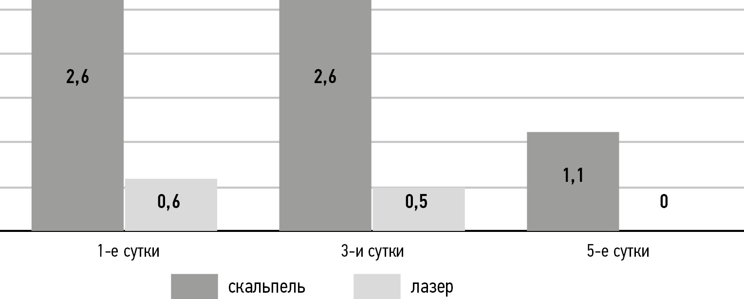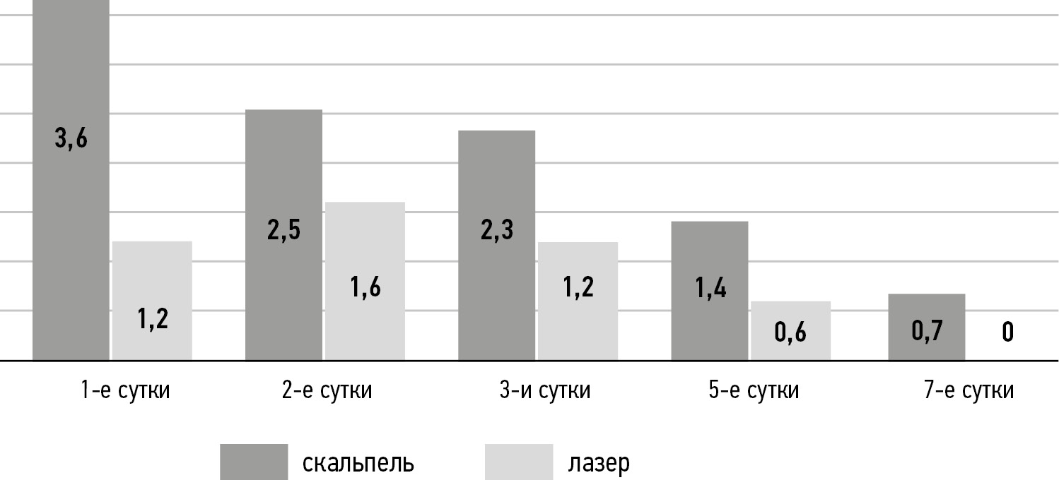 При двухфакторном дисперсионном анализе статистически значимых различий для групп пациентов, прооперированных скальпелем и лазером, не обнаружено, однако при попарном сравнении по t-критерию для независимых выборок на каждом сроке выявлены статистически значимые различия на 1-е (p < 0,002725), 2-е (p < 0,032585), 3-и (p < 0,011616), 5-е (p < 0,024019) и 7-е сутки (p < 0,015715). Полученные данные свидетельствуют о более выраженной болевой симптоматике у пациентов, прооперированных с использованием скальпеля.