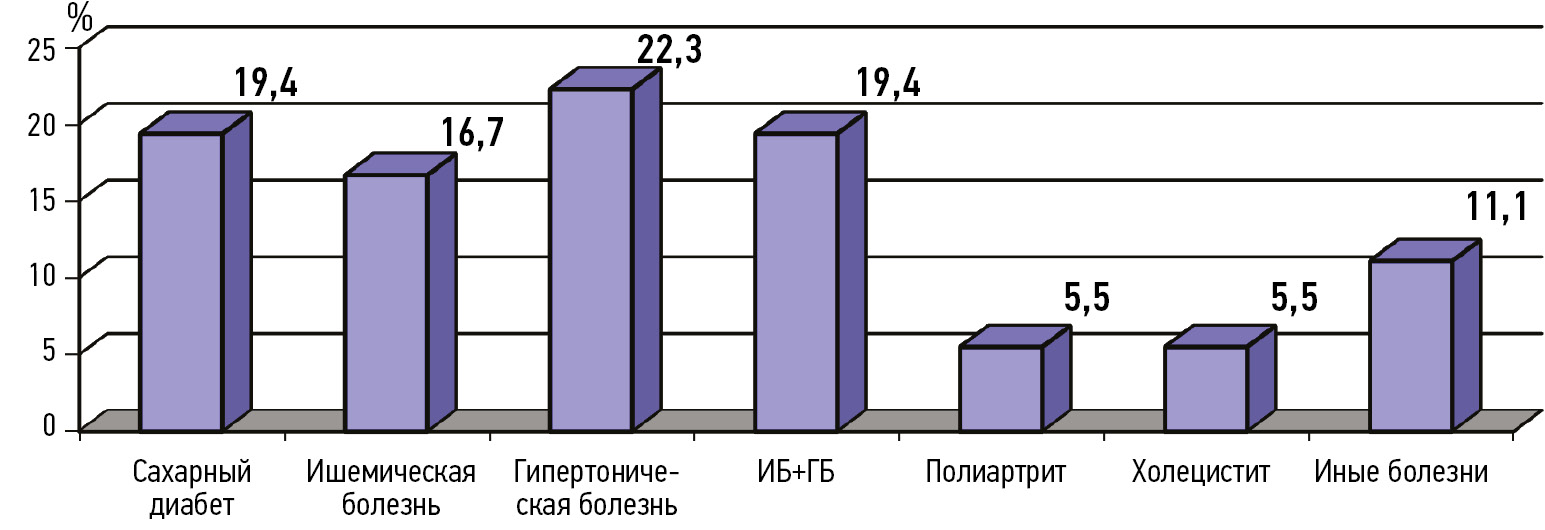 Рис. 1. Соматические заболевания у пациентов с новой коронавирусной инфекцией, %. ИБ — ишемическая болезнь, ГБ — гипертоническая болезнь.
