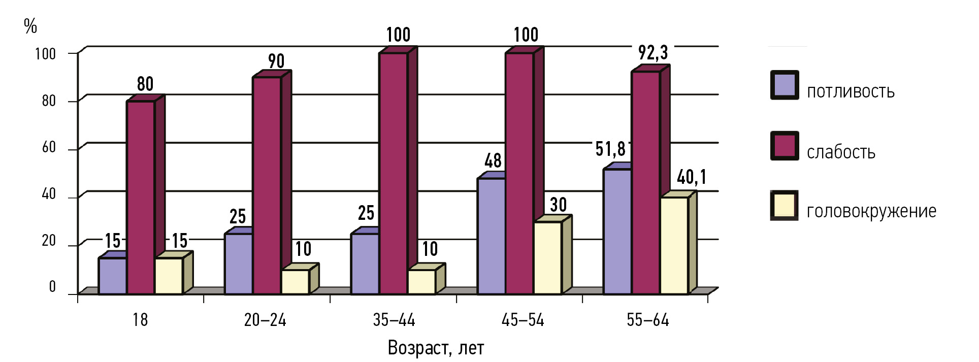 В 5-й группе с COVID-19 92,3% пациентов отмечали выраженную потливость. Все пациенты отмечали выраженную общую слабость (рис. 2).