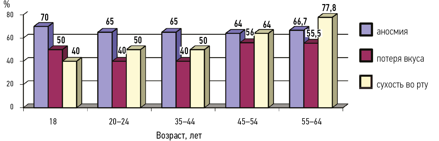 В старших возрастных группах отмечена кровоточивость десны (20% в 4-й группе и 18,5% в 5-й группе). Цианоз слизистой оболочки выявлен в 5-й возрастной группе у 21% больных, а в 4-й группе — у 16%. У пациентов с COVID-19 в 1-й группе жалобы на симптомы агевзии встречаются в 50% случаев, во 2-й — в 40%, в 3-й — в 40%, в 4-й — в 56%, в 5-й — в 55,5%. Достаточно часто отмечались жалобы на гипосаливацию, увеличивающуюся с возрастом. Галитоз встречался у 8% обследованных из 4-й группы и у 11,1% человек из 5-й группы.