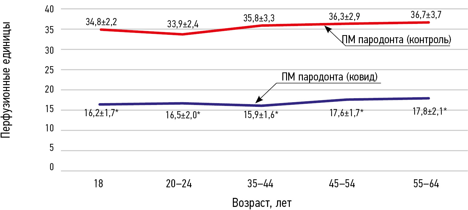 Рис. 4. Сравнительный анализ показателей микроциркуляции (ПМ) тканей пародонта, перфузионные единицы; * различия статистически значимы по сравнению с контрольной группой (р < 0,001).