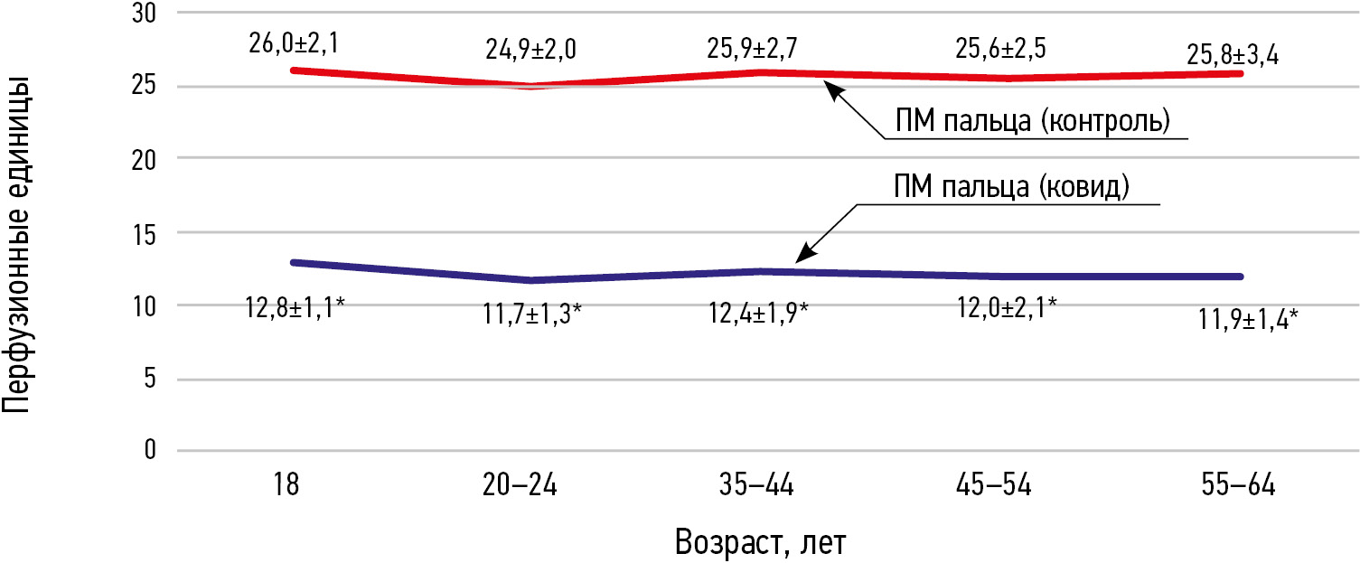 Рис. 5. Сравнительный анализ показателей микроциркуляции (ПМ) на фаланге пальца; * различия статистически значимы по сравнению с контрольной группой (р < 0,001).