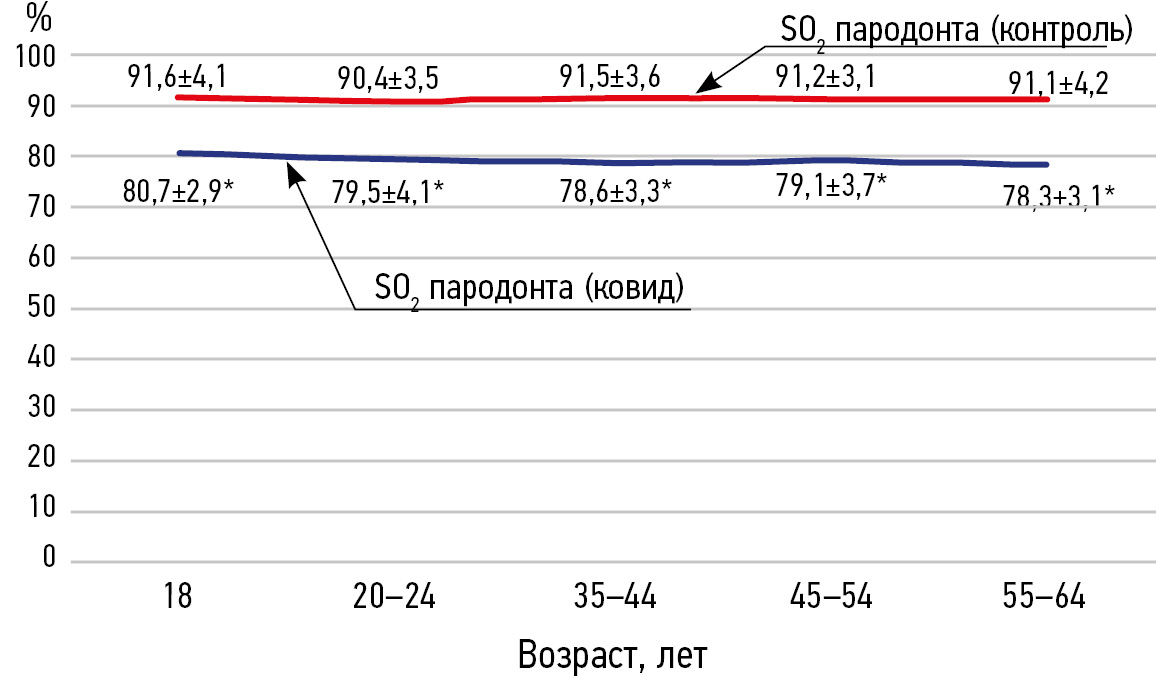 Рис. 6. Сравнительный анализ сатурации тканей (SO2) пародонта у пациентов; * различия статистически значимы по сравнению с контрольной группой (р < 0,05).