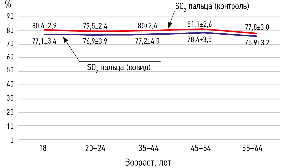 Данные, полученные при проведении лазерной допплеровской флоуметрии у пациентов с COVID-19, свидетельствуют о снижении сатурации во всех возрастных группах. Насыщение гемоглобина кислородом было ниже у пациентов с COVID-19 и в тканях пародонта, и на фаланге пальца (рис. 6, 7).