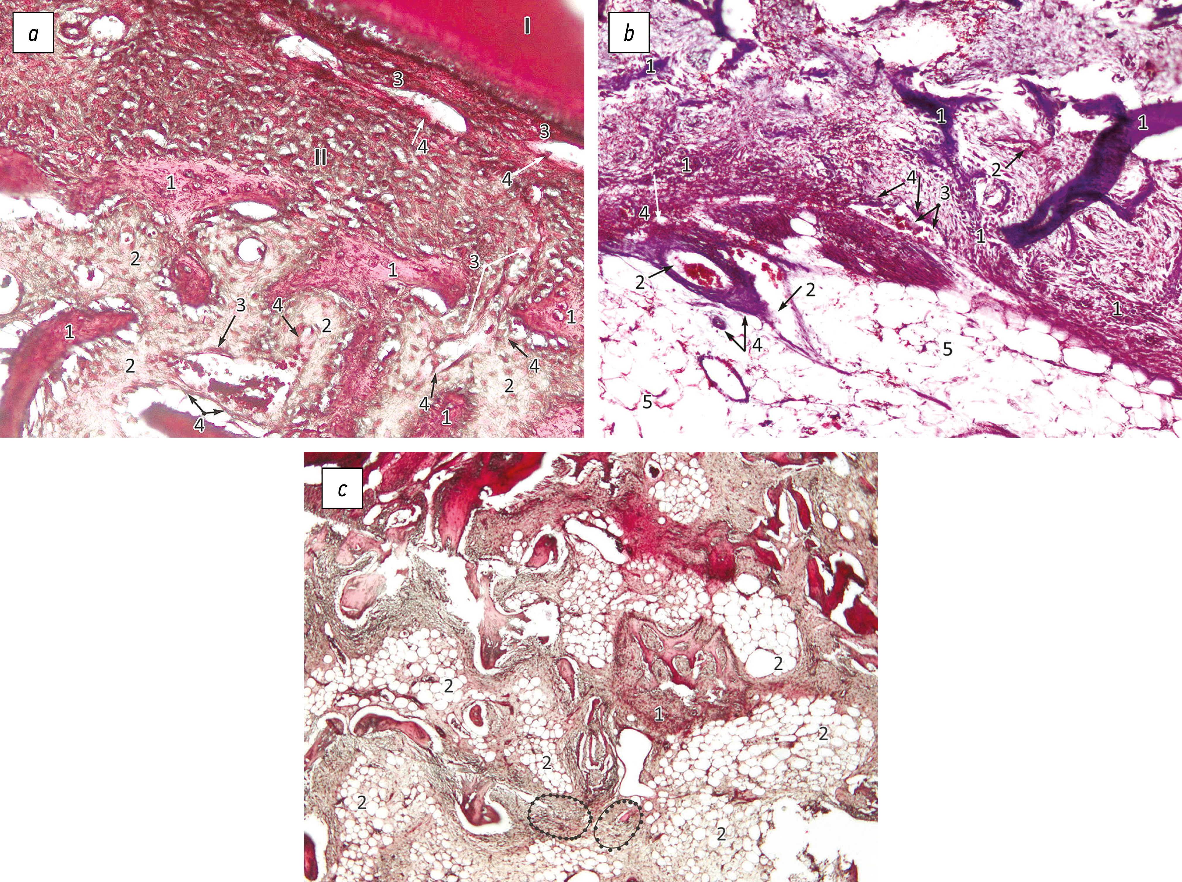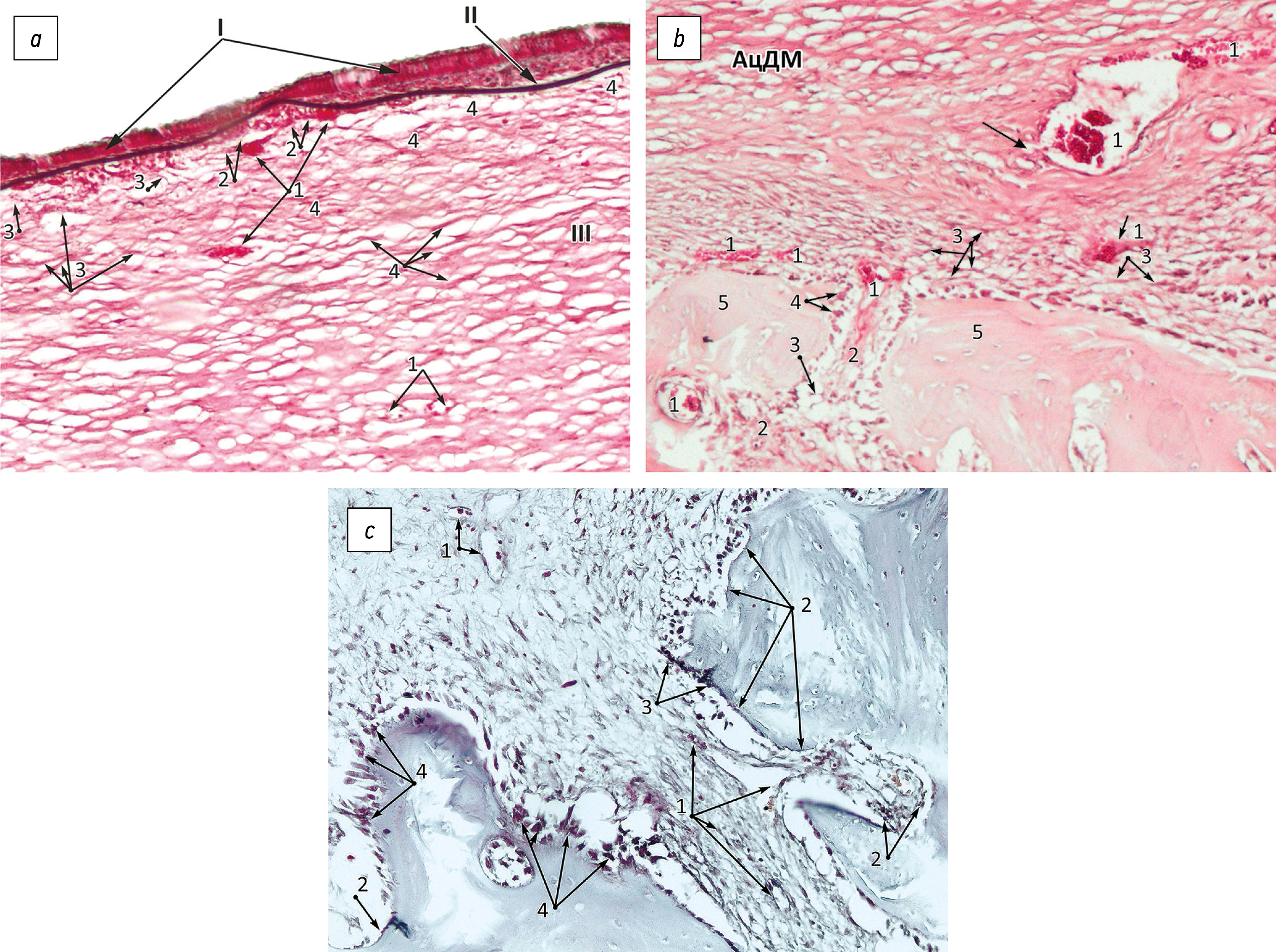 В группе 2 биодеградация ацеллюлярного дермального матрикса произошла почти полностью; сформирован многослойный плоский ороговевающий эпителий (рис. 2, а). В большем числе образцов группы эпителиальные тяжи прорастали сквозь толщу плотной волокнистой соединительной ткани, почти до уровня нахождения нерезорбированных остеокондуктивных гранул (рис. 2, b, 1). Под остаточным слоем АцДМ видны грубоволокнистые структуры костных балок с гиперклеточностью за счёт множества промежуточных клеточных форм. Локализуясь по границе с межбалочными пространствами, они взаимодействуют друг с другом, образуя небольшие переплетения цитоплазматических отростков. Видны также их контакты с регрессируемыми эндостальными поверхностями костных балок; в некоторых участках эндост отсутствует, заметен эффект «размывания» границ с межбалочными костномозговыми пространствами. Изменена структура ретикулярной ткани межбалочных пространств в виде увеличения плотности и появления зон фиброза. В сформированных ранее костных балках видно замещение остеоцитарных клеток бессосудистой плотной волокнистой соединительной тканью, в составе костных балок определяются оставшиеся нерезорбированными гранулы биоматериала.