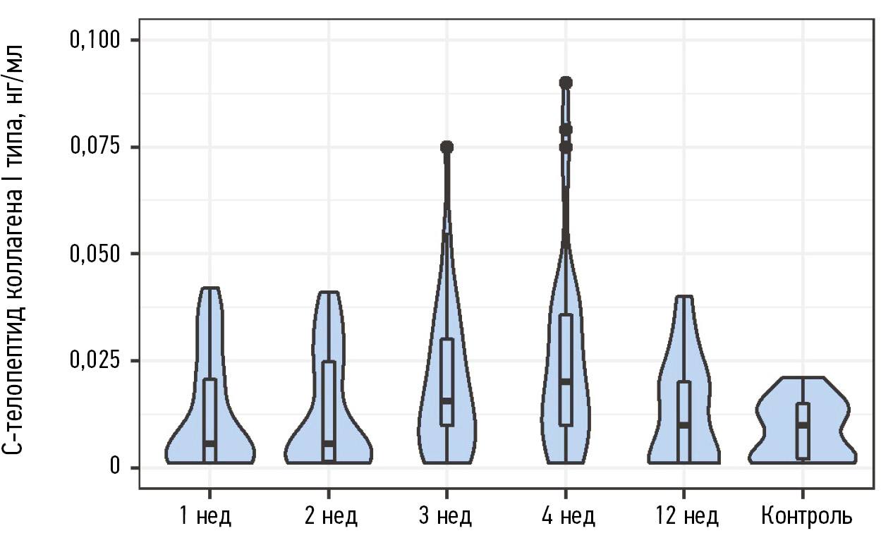 На начало наблюдения концентрация β-CrossLaрs (рис. 1) в основной группе составила 0,006 [0, 001; 0, 022] нг/мл и статистически значимо не отличалась от значений в контрольной группе — 0,010 [0, 002; 0, 015] нг/мл (р > 0,05). На 3–4-й неделе выявлены статистически значимые отличия у пациентов основной группы от показателей у этих же обследованных на 1–2-й неделе (оба р < 0,001) и от пациентов в группе контроля (р = 0,050 на 3-й неделе и р = 0,007 на 4-й неделе).