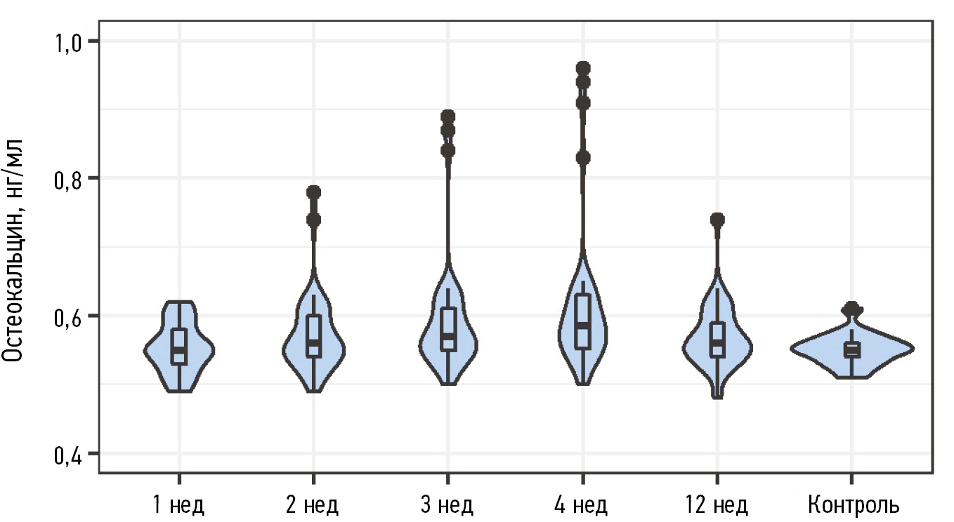 Через 3 мес после начала исследования (на 12-й неделе) в основной группе содержание остеокальцина практически вернулось к исходным значениям: 0,56 [0, 54; 0, 59] нг/мл, что неотличимо от контроля (р = 0,170). У одного пациента отмечено повышенное значение данного показателя (0,74 нг/мл) относительно других пациентов основной группы.