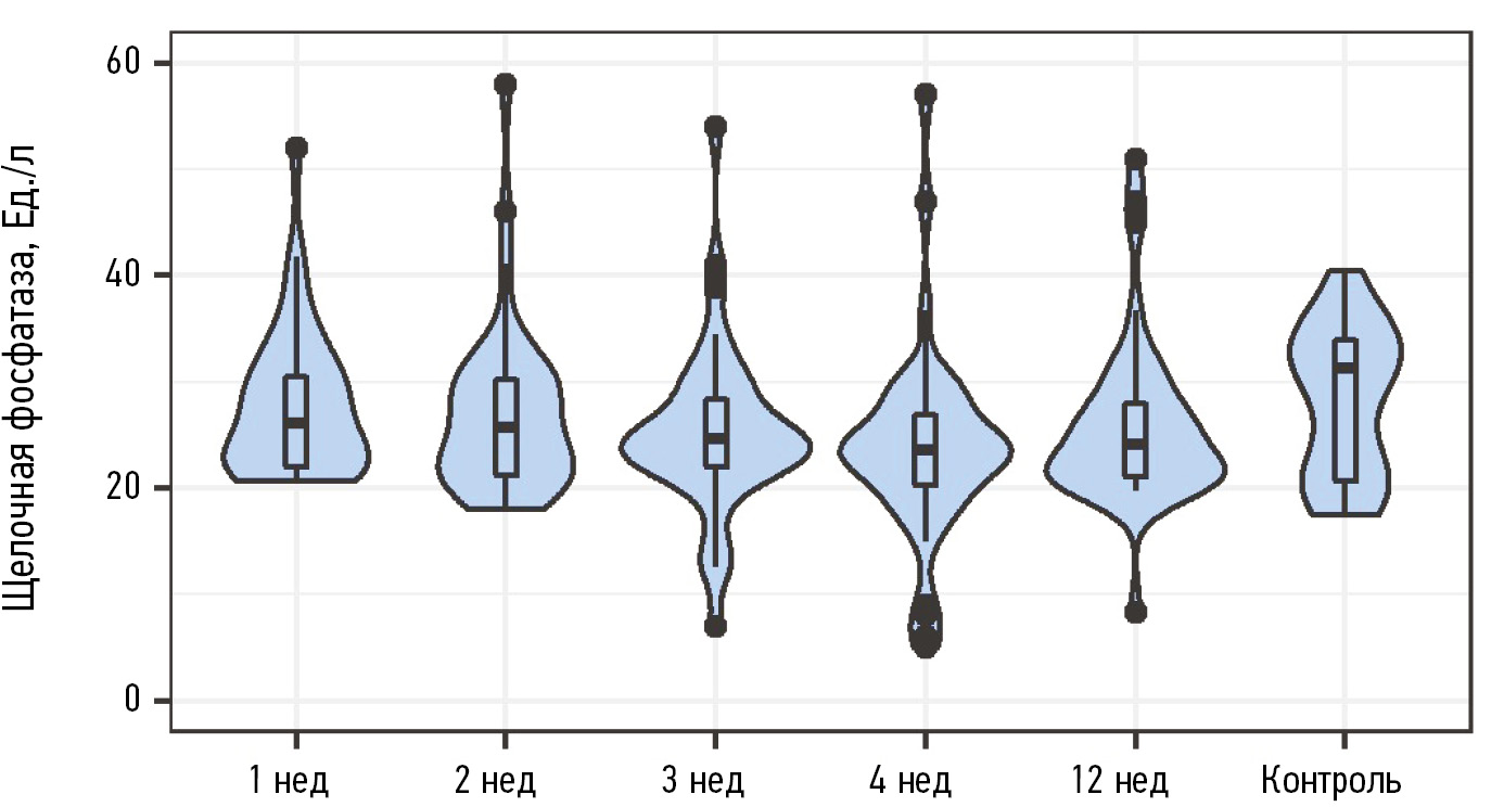 На 4-й неделе по-прежнему наблюдались более высокие значения дисперсий, чем в группе контроля, и выявлены статистически значимые различия в средних тенденциях выборок. Так, медианные значения и межквартильный размах в основной группе составили 23,65 [19, 75; 27, 05] Ед./л (р = 0,046 по сравнению с контролем). Клинически представляют интерес случаи со снижением активности щелочной фосфатазы. У четырёх пациентов активность щелочной фосфатазы РЖ оказалась менее 10 Ед./л: 5,0; 6,0; 8,0; 9,0 Ед./л.