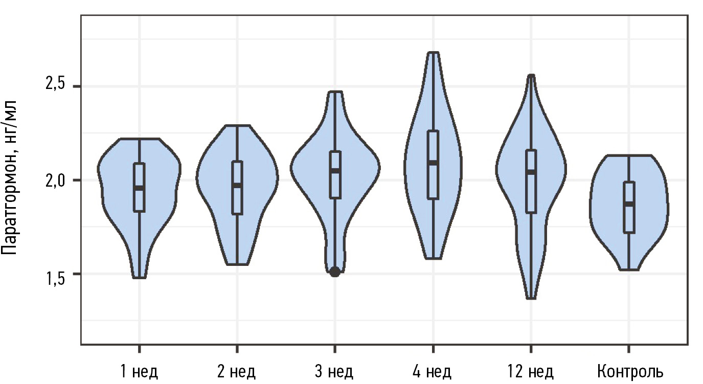 Через 12 нед после вмешательства статистически значимых отличий концентрации паратгормона не было как в сравнении с контрольной группой, так и с результатами на 1-й неделе, значения составили 2,04 [1, 79; 2, 17] нг/мл.