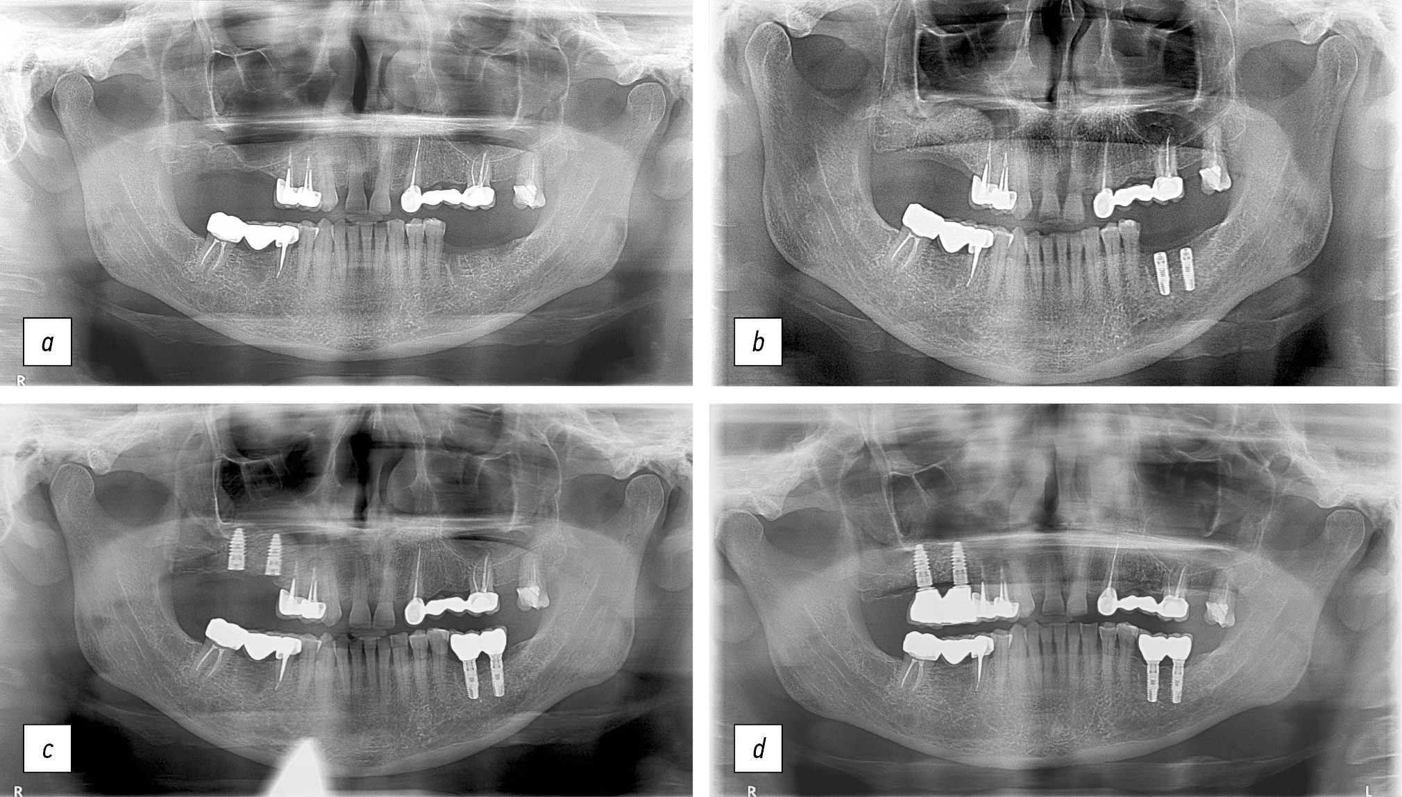 Рис. 5. Ортопантомограммы пациента Ч.: a — исходная клиническая ситуация; b — проведена аугментация с использованием лиофилизированной губчатой костной ткани; c — установлены дентальные имплантаты, этап остеоинтеграции; d — клиническая ситуация через 3 года.