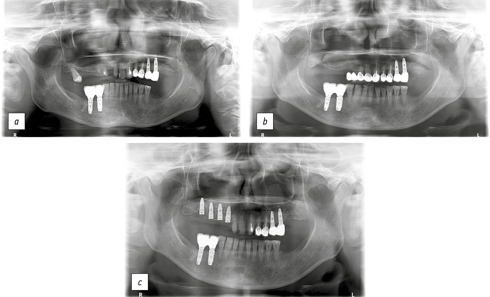 Рис. 6. Ортопантомограммы пациентки Б.: a — исходная клиническая ситуация; b — проведена аугментация с использованием лиофилизированной губчатой костной ткани; c — установлены дентальные имплантаты, этап остеоинтеграции.