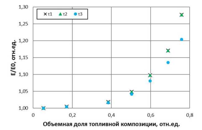 На рис. 3 для временного интервала, ограниченного продолжительностью импульса мощности, приведена энергия, выделившаяся при учете плавления силуминовой матрицы (E), отнесенная к выделившейся энергии в традиционной, не учитывающей плавление, модели (E0) в зависимости от объемной доли ТК, достигшей температуры 577 °С (отнесенной к объему ТК во всей активной зоне). При этом рассматривались вводимые скачком величины реактивности Δρ от 1,6 до 2,2 βэф с результирующей полушириной импульса от 5,3∙10-5 до 2,7∙10-5 с соответственно (Δτ = 3,542l / (Δρ – βэф) [8], l = 10-5 с – время жизни мгновенных нейтронов). Изменения величины Δρ в указанном интервале задавались от расчета к расчету с шагом 0,1 βэф. Каждый расчет отмечен на графиках точкой.