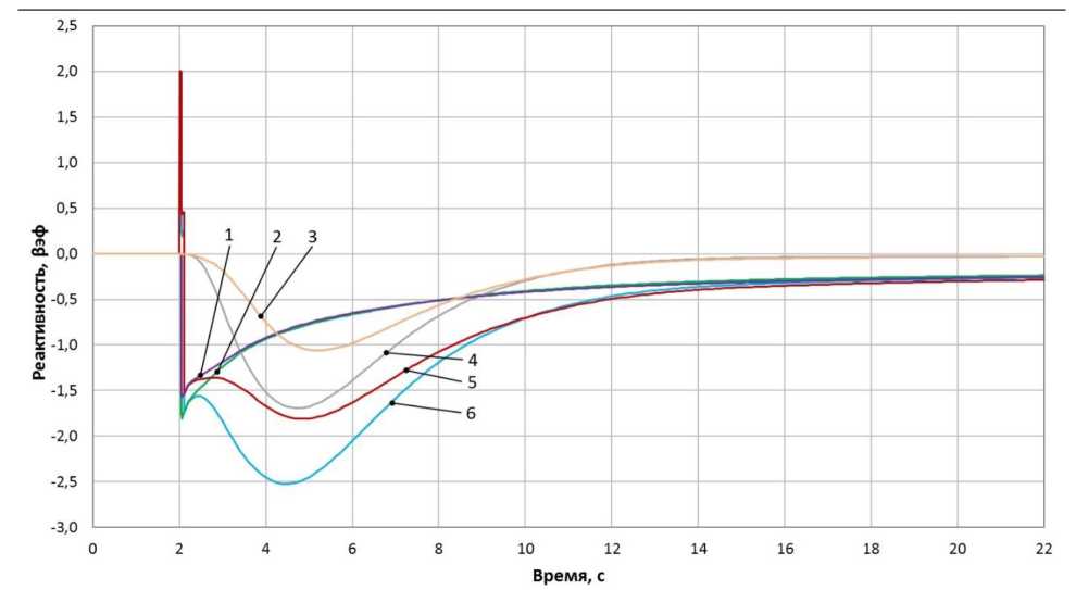 Рис. 5. Зависимость реактивностных эффектов от времени: 1, 2 – доплеровский эффект; 3, 4 – эффект по теплоносителю; 5, 6 – суммарная реактивность; кривые 1, 3, 5 соответствуют τ = τ1; кривые 2, 4, 6 соответствуют τ = 0