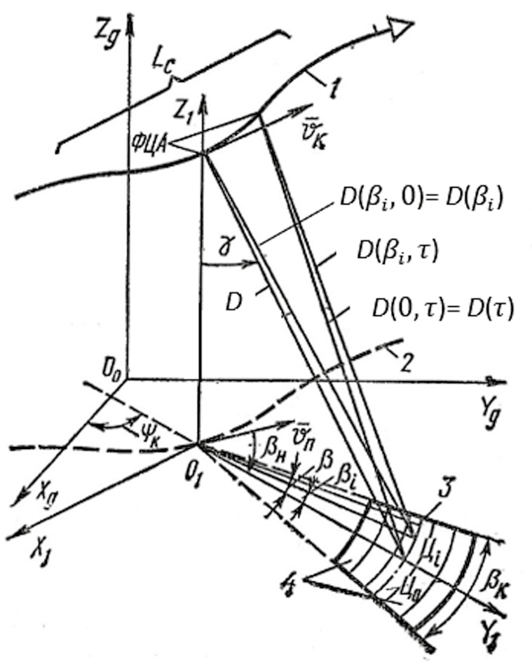 Ось проходит в тот же момент времени через опорную точку Ц0 , расположенную под углом βн относительно вектора νn путевой скорости ЛА. Углы ψк и γк ― соответственно углы карты и падения; νк ― вектор земной (полной) скорости ФЦА (ЛА); β ― текущее значение азимутального угла относительно оси O1Y1 в пределах углового размера βк кадра РЛИ (для упрощения записи аргумент t в последующих соотношениях опущен); 1 и 2 ― траектория и линии пути ФЦА (ЛА), 3 и 4 ― кадр РЛИ и полоски равных дальностей.