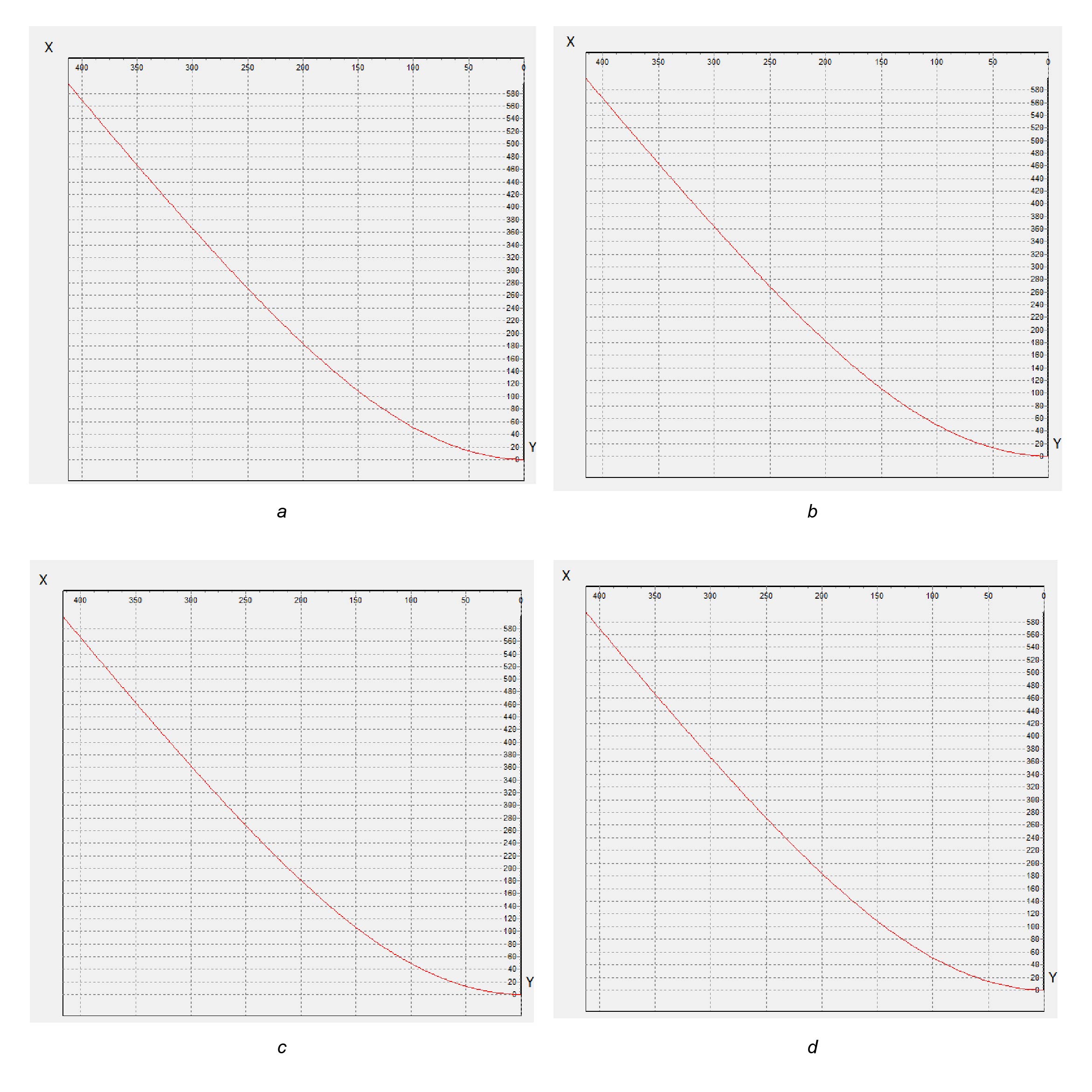 Рис. 4. Конфигурация кабель-троса при постоянных скоростях буксировки и течения. a — расчет с начальной глубиной Y0=200 до поверхности 12,89 м, b — расчет с начальной глубиной Y0=195 до поверхности 7,53 м, c — расчет с начальной глубиной Y0=190 до поверхности 2,53 м, d — расчет с начальной глубиной Y0=188 до поверхности 0,52 м.