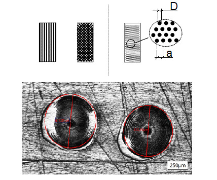 Для получения микроямок с определенными свойствами несколько лазерных импульсов подавали на поверхность (импульсный режим). Параметры лазерной обработки: напряжение 300–400 В; длительность 0,75 мс; частота 1–4 Гц. Диаметр микроямок был установлен в диапазоне 90–400 мкм и зависел от параметров обработки. Расстояние между ними варьировалось для получения различных долей структурированной площади поверхности. Для создания микротекстур в виде круглых углублений на канавке и ленточке сверла была опробована технология лазерной микрообработки с различной плотностью заполнения: 10, 20, 30 и 40 %.