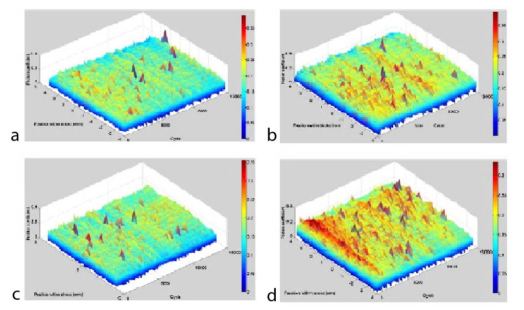 Fig. 6. Surface topography maps for a load of 2.94 N: a, c, textured surface, test 1, 2; b, d, non-textured surface, test 1, 2.