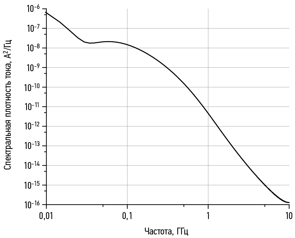 где t — время, выраженное в наносекундах. На рис. 2 показана спектральная плотность тока (5), полученная с помощью быстрого преобразования Фурье с шагом по времени τ = 0,05 нс и числом отсчетов N = 4096.