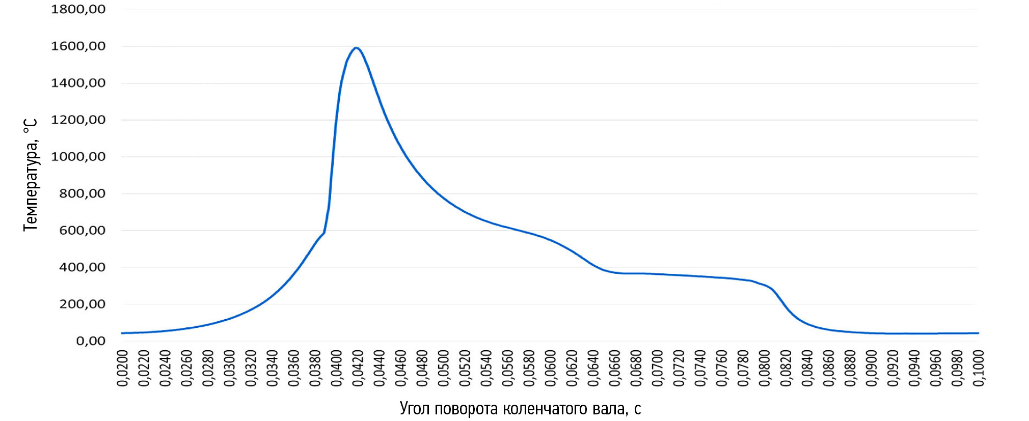 При валидации результатов моделирования использовались зависимости температуры и давления от угла поворота коленчатого вала. Сравнение диаграмм, построенных при нестационарном термомеханическом моделировании температуры и давления в ПК Ansys (рис. 8), с индикаторной диаграммой построенной в Дизель РК (см. рис. 2) не дали расхождений более чем 5%.