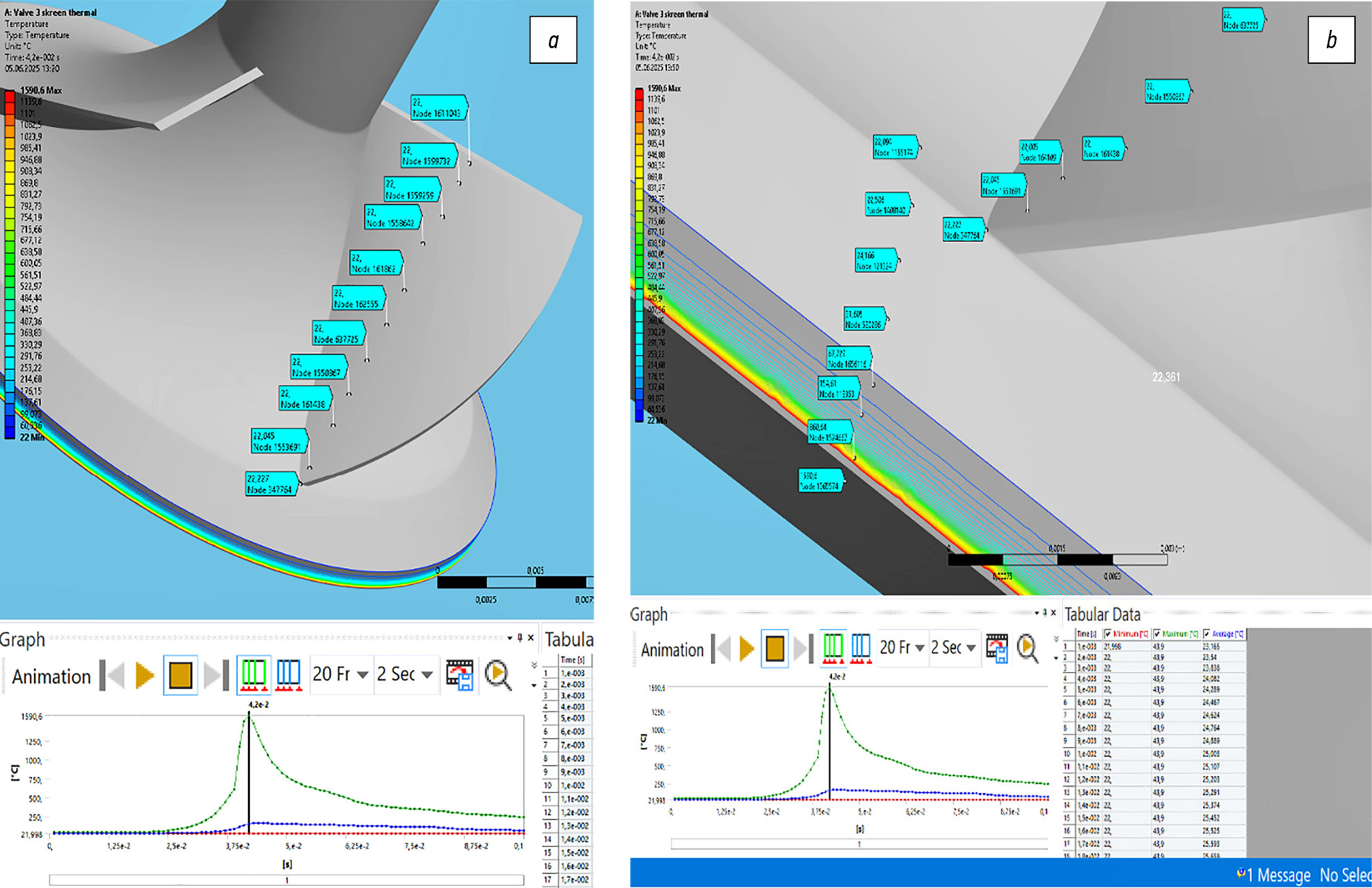 CONCLUSION: The simulation allowed to collect data on the temperature distribution inside valve trays of the studied 40X steel valves, which can be viewed at any time of the studied interval. The study of the heat flux in valves of different designs revealed that the heat flux increased in the valve with 3 blades (283.12 W/mm2) and the heat flux in the design with 6 blades was 281.49 W/mm2.