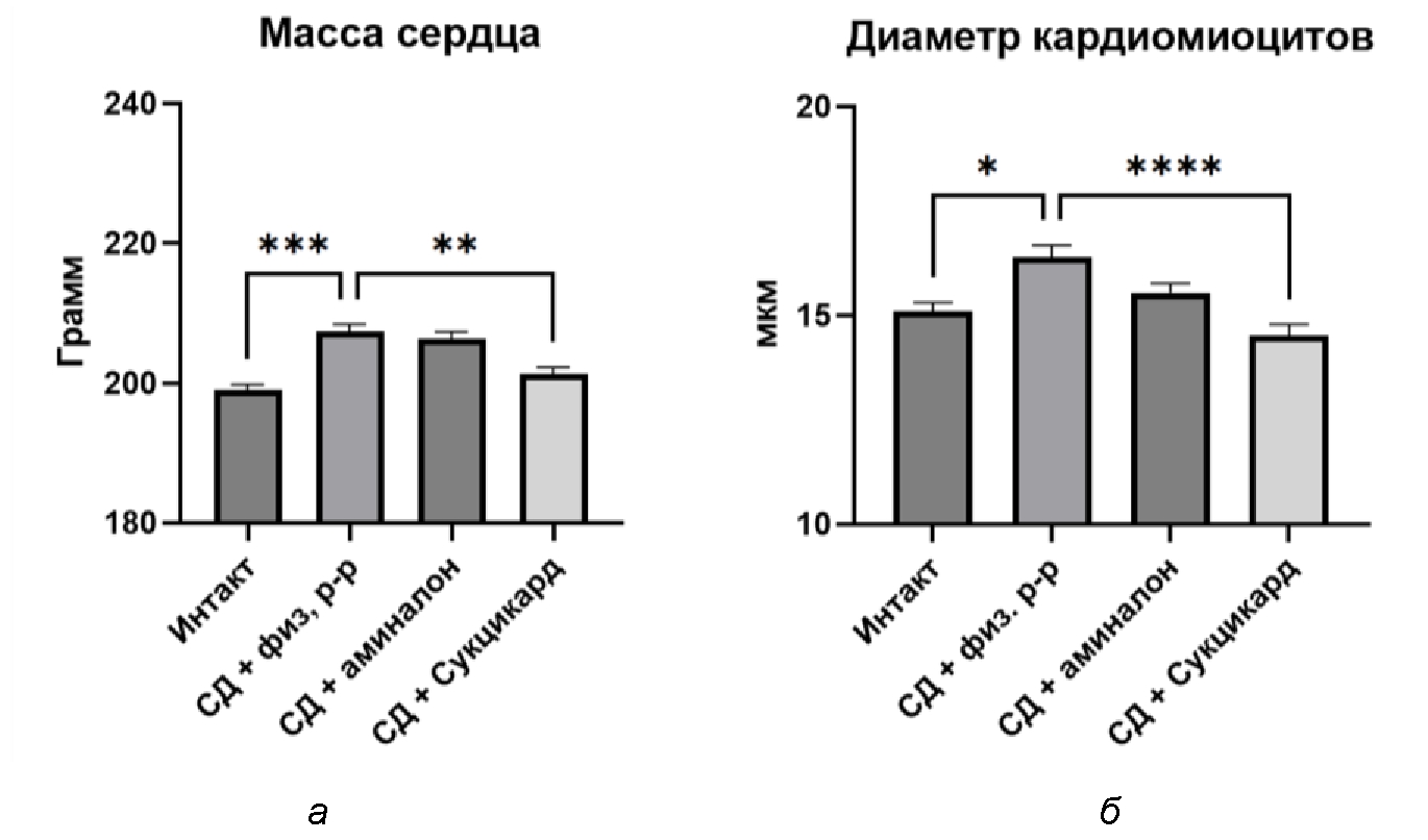 Рис. 2. Результаты измерения массы сердца (а); результаты морфометрии кардиомиоцитов миокарда (б); * – p < 0,05 ,** – p < 0,01, *** – p < 0,001, **** – p < 0,0001