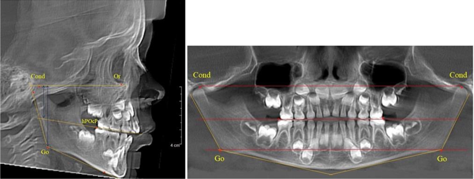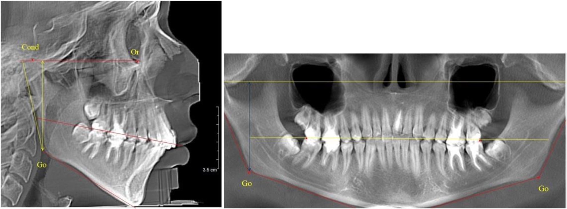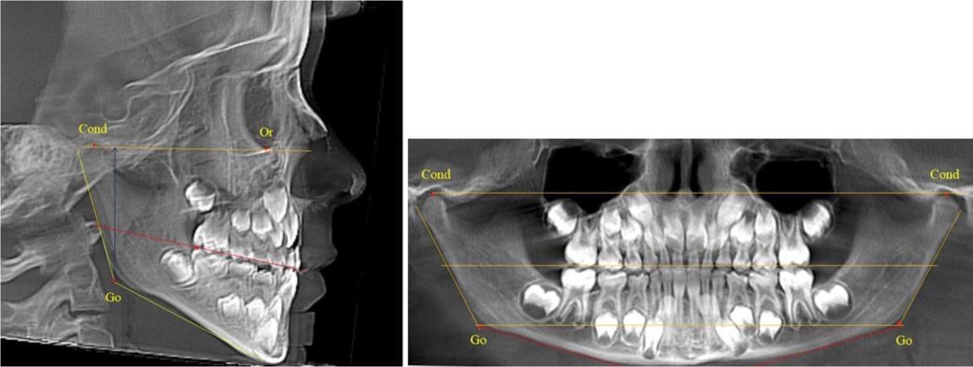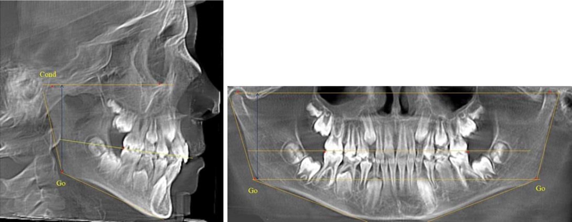 На ортопантомограмме точки Cond соединяли между собой суставной линией Cond-Cond.  Касательная к ветви нижней челюсти соединяла выступающие точки, которые соединялись в области угла и определяли положение точки гонион Go с обеих сторон, которые соединяли гониональной линией Go-Go.