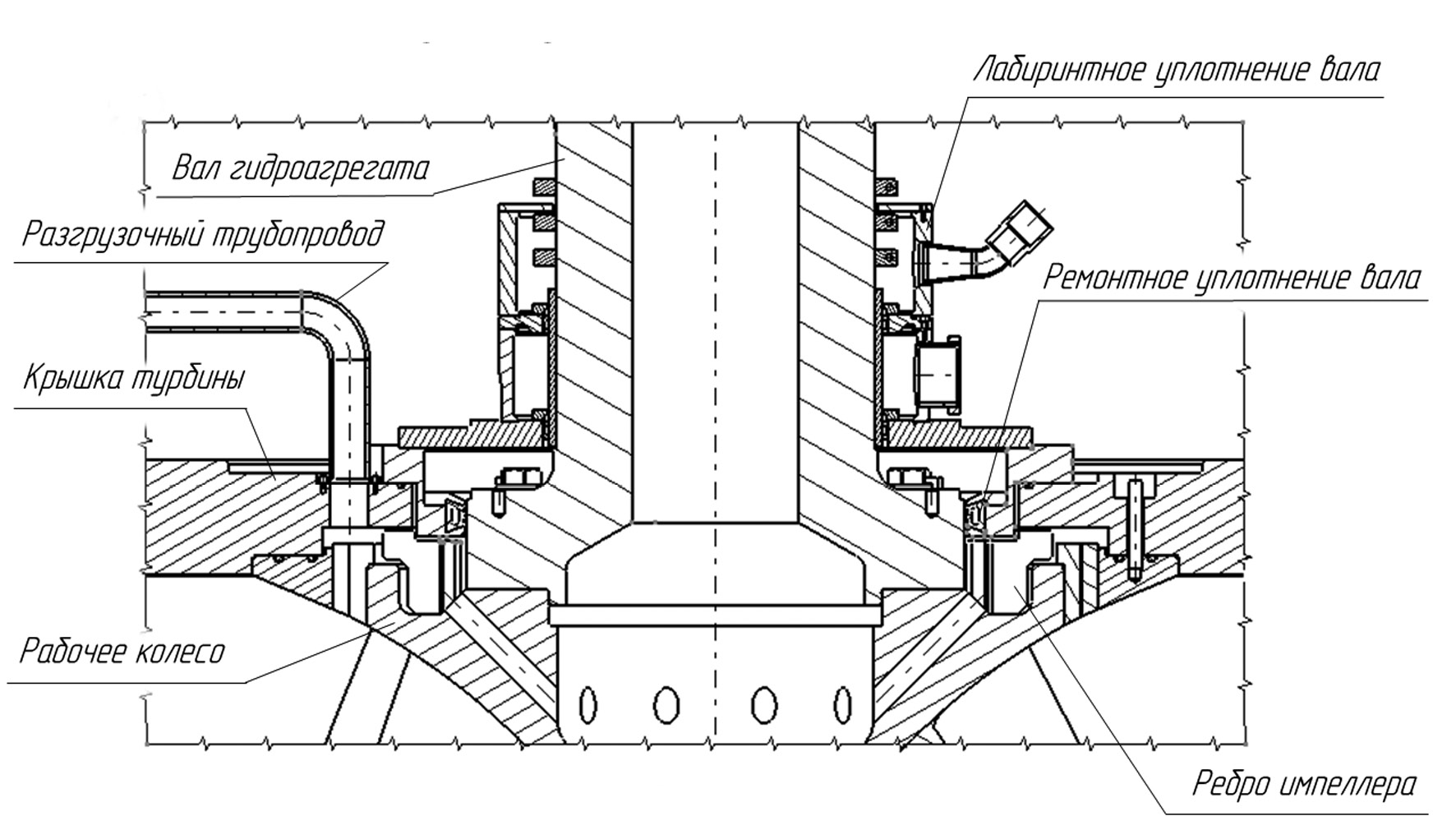 Результаты. Разработана конструкция уплотнения вала импеллерно-лабиринтного типа (рис. 1), включающая разгрузочные трубопроводы в крышке турбины.