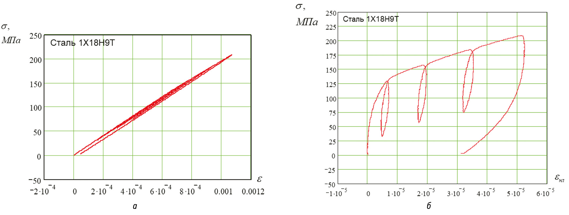 Рис. 2. График петли гистерезиса в образце из стали 1Х18Н9Т в координатах σ – ε (а) и график петли гистерезиса в образце из стали 1Х18Н9Т в координатах σ – εнл (б)