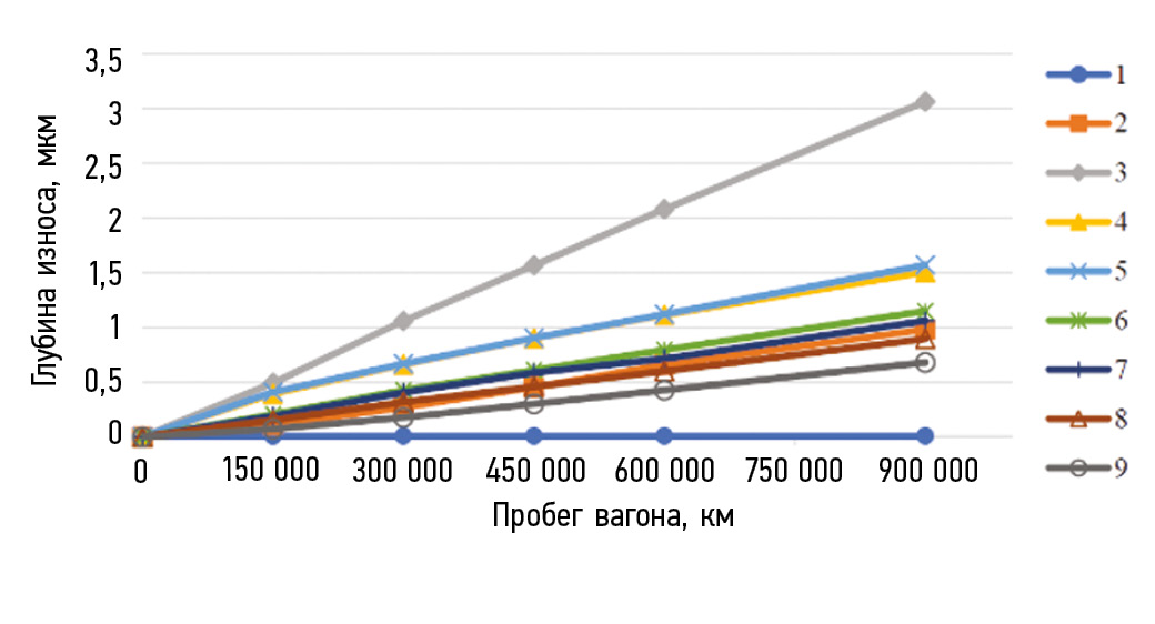 Результаты расчета с периодом 150 000 км показывают устойчивое изменение скорости износа как для ролика (рис. 3), так и для дорожки качения внутреннего кольца. Дальнейшее уменьшение периода пересчета условий взаимодействия роликов и колец не приводит к сколько-нибудь заметному уточнению накопленной величины износа. Из полученных результатов также следует, что износ дорожки качения внутреннего кольца происходит примерно в 1,5 раза быстрее, чем износ роликов.