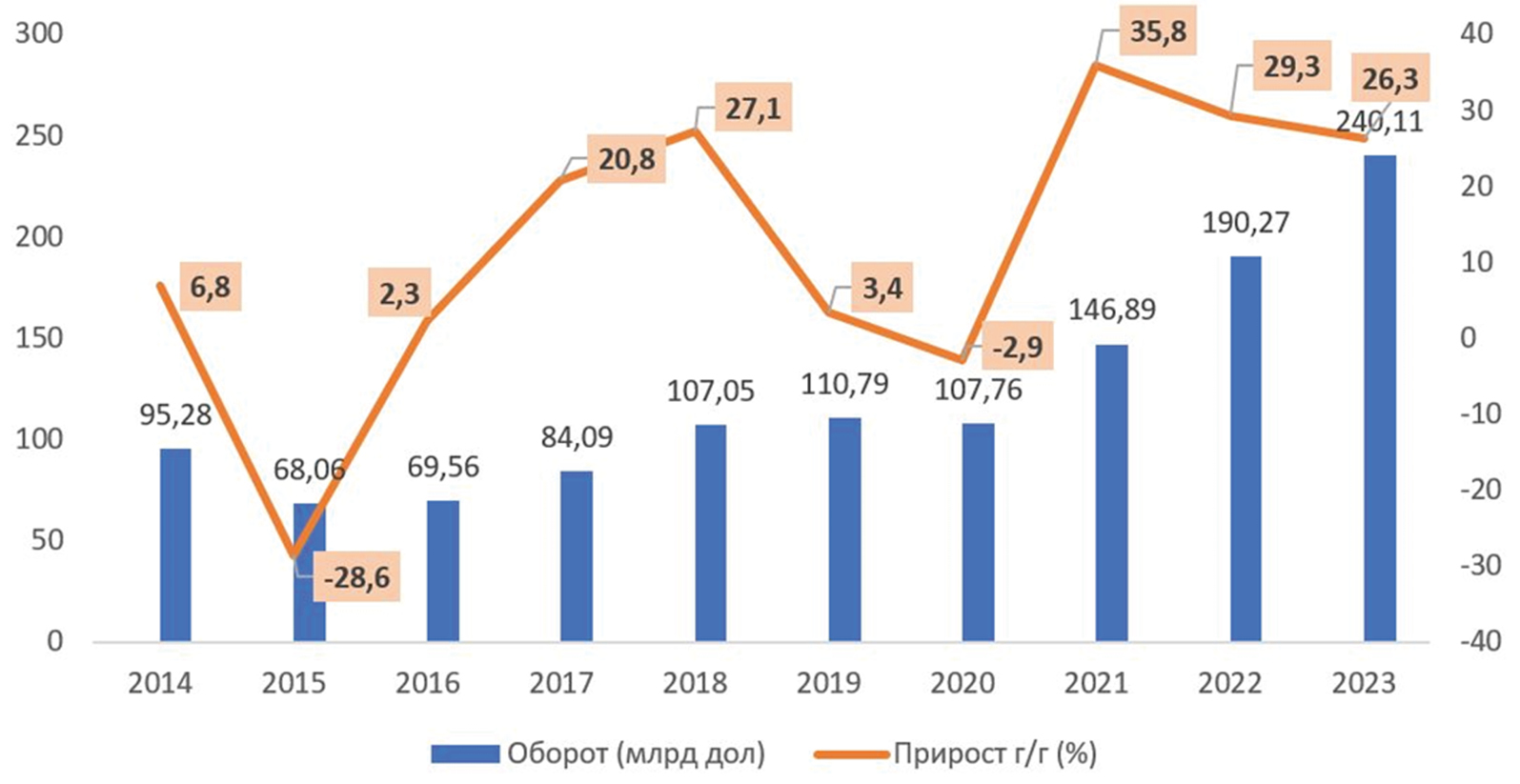 Рис. 1. Динамика китайско-российской торговли 2014–2023 гг.